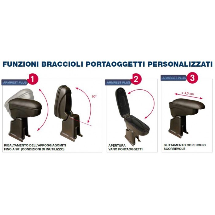Il nostro bracciolo portaoggetti si fissa facilmente al tunnel centrale o al pianale della tua auto, senza necessità di modifiche. Progettato per non interferire con i movimenti dei sedili, offre praticità e comfort. Rivestito in similpelle di alta qualità con eleganti cuciture longitudinali, aggiunge un tocco di stile all’interno dell'auto. Il coperchio, morbido e imbottito, si chiude in modo sicuro grazie alla chiusura magnetica. L’ampio vano portaoggetti è rivestito in floccato, per una maggiore protezione degli oggetti riposti. Il montaggio è semplice, grazie alle 4 viti autofilettanti con coperchietti inclusi. Il bracciolo è reclinabile fino a 90°, e il modello Armrest Plus è dotato di un pratico coperchio scorrevole.