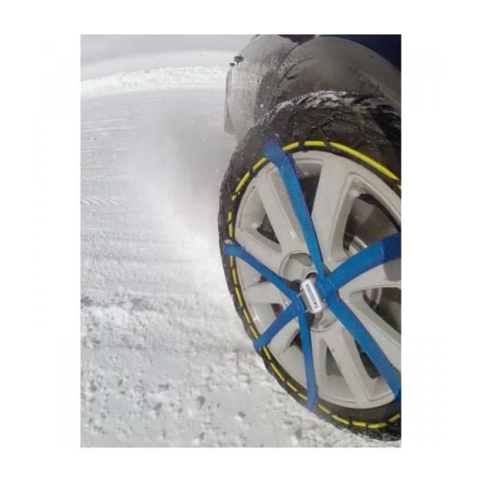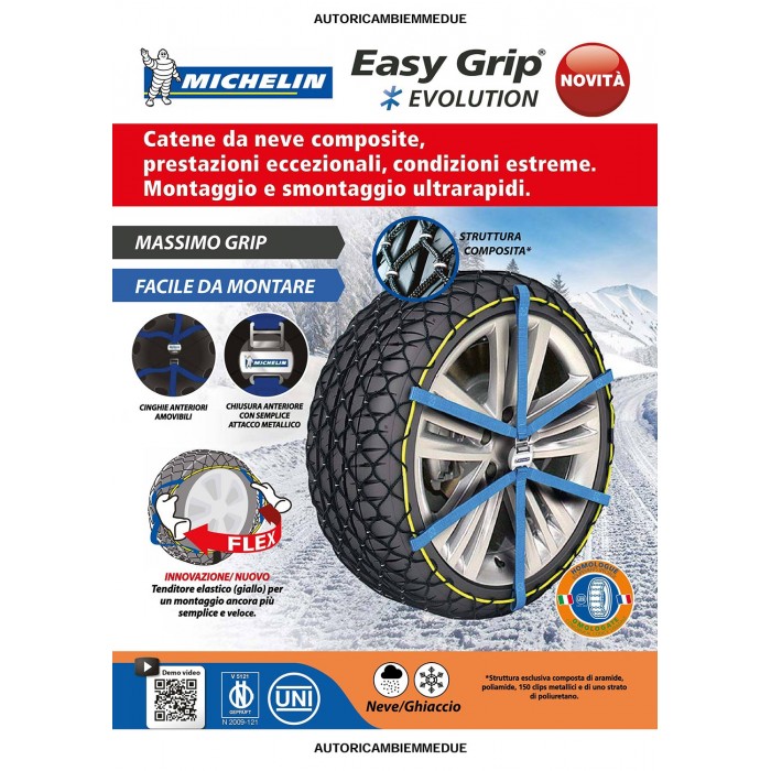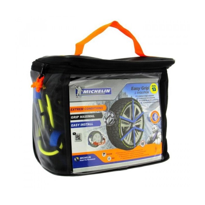 Catena da neve Michelin in materiale composito ad altissima tecnologia con una struttura esclusiva che assicura una motricità ottimale su neve e ghiaccio, in trazione, in frenata, in accelerazione e in curva. Di facile montaggio e smontaggio si monta come una calza, con una struttura esclusiva composta di aramide, poliamide,150 clips metallici e di uno strato di poliuretano. Il montaggio e facile e rapido in 2 minuti per auto e Suv .Una larga banda tessile sulla parte interna del pneumatico permette una migliore tenuta sulla ruota. Con un minimo spessore interno può essere compatibile con sistemi ABS e ESP Sistema catarifrangente NVS (Night Vision Security) per una migliore visibilità laterale del veicolo. Omologate in Italia UNI 11313:2010. Adatte solo per veicoli catenabili fornita di borsa pratica, ergonomica e perforata per permettere l'evaporazione dalla catene una volta riposte in auto.