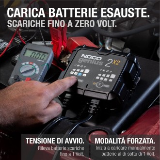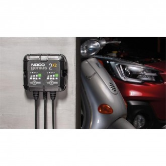 Caricabatterie Multifunzionale Noco Genius X2 è un dispositivo versatile che combina le funzioni di caricabatterie, mantenitore di carica e desolfatatore. Grazie alle sue due uscite, può caricare simultaneamente due batterie in modalità completamente automatica, rilevando e caricando in sicurezza anche batterie danneggiate. Genius X2 è ideale per la manutenzione a lungo termine, impedendo sovraccarichi e assicurando un funzionamento continuo senza necessità di intervento manuale.