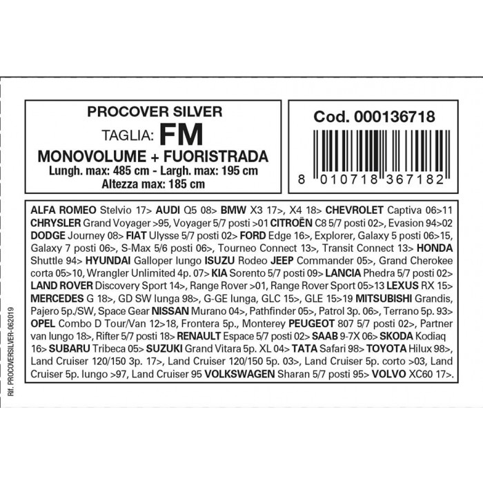 Adatto alle seguenti vetture:Audi Q5 08>12, 12> - Chevrolet Captiva 06>11 - Chrysler Grand Voyager >95, Voyager >01 - Citroen C8, Evasion - Dodge Journey - Fiat Ulysse 02> - Ford Explorer, Galaxy 06>10, 10> - Honda Shuttle - Hyundai Galloper Lungo - Isuzu Rodeo - Jeep Commander, Grand Cherokee Corta 05>10, Wrangler 5P. 07> - Kia Sorento 09> - Lancia Phedra - Land Rover Range Rover >01, Range Rover Sport 05> - Mercedes Gd S.W. Lunga 98>, G-Ge Lunga - Mitsubishi Grandis, Pajero 5P. >07, 07>, Pajero S.W., Space Gear - Nissan Murano 04>, Pathfinder 05>, Patrol 3P. 06>, Patrol S.W./Patrol (Lunga) >06, Terrano Ii (5P.) - Opel Combo 12>, Frontera 5P. - Monterey - Peugeot 807 - Renault Espace 03> - Saab 9-7X 06> - Subaru B9 Tribeca - Suzuki Grand Vitara 5P. Xl 04> - Tata Safari - Toyota Hi-Lux 98>, Land Cruiser 120/150 5P. 03>, Land Cruiser 5P. Corto >03, Land Cruiser 5P. Lungo >97, Land Cruiser 95 - Volkswagen Sharan 96>10, 10>.