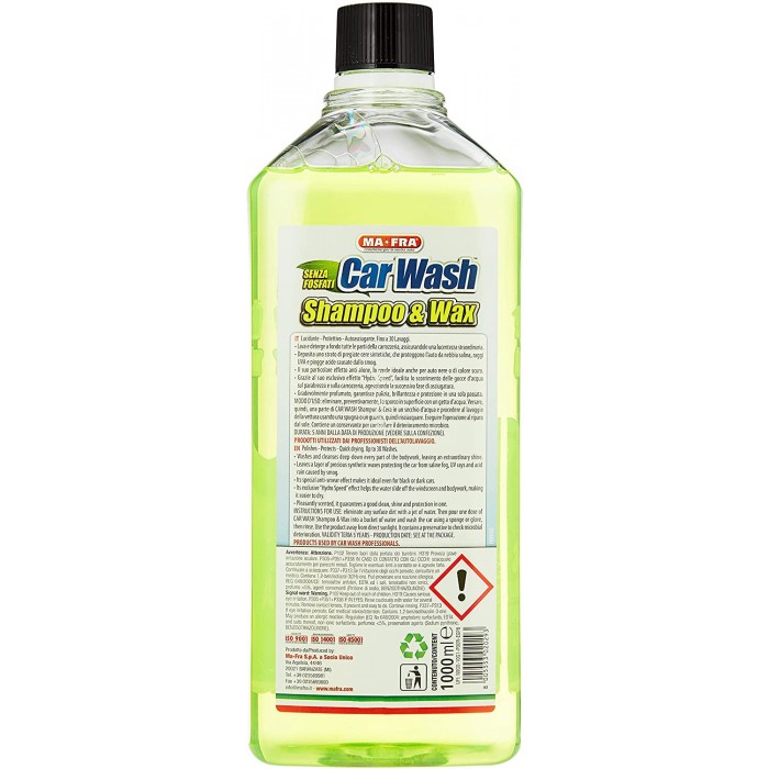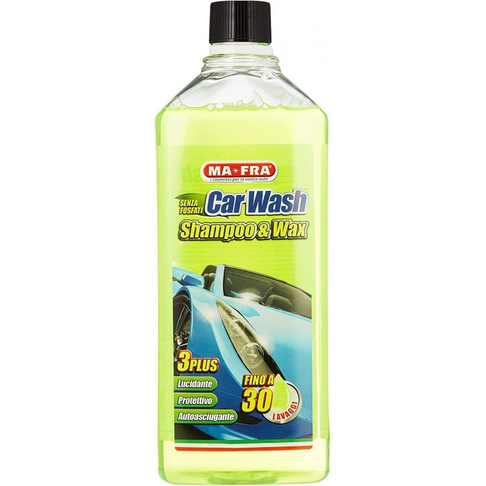 Shampoo Mafra per tutti i tipi di vernice di auto, moto, roulotte e barca. Deterge, lucida e incera in un'unica operazione. Svolge una profonda azione sgrassante e detergente senza alterare il colore o la brillantezza di vernici. Contiene delle sostanze che nel corso del lavaggio producono un sottile film protettivo effetto lucido sulle superfici trattate. Confezione da litro.