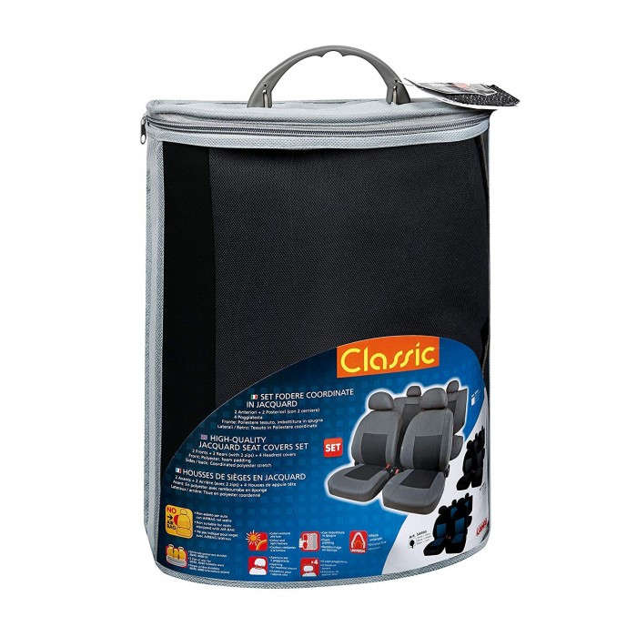 Set foderine comprende 2 foderine anteriori, 2 foderine posteriori (con 2 cerniere) 4 copripoggiatesta. Tessuto in poliestere e imbottiture in spugna. Universali per la maggior parte delle vetture con sedili standard. (!) Note: Universali per la maggior parte dei sedili standard ,non sono compatibili con sedili forniti di airbag laterali, colori resistenti alla luce imbottitura morbida poggiatesta inclusi con fessura senza velcro. Zip per bracciolo.