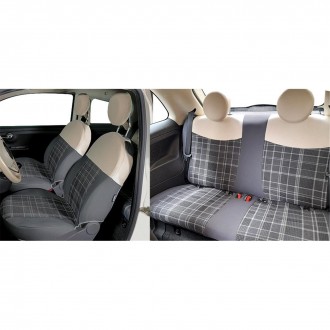 Serie completa coprisedili (anteriori + posteriore intero) tessuto Scozia-grigio-crema realizzati su misura per Fiat 500 dal 2007. In cotone e maglino accoppiati con imbottitura in spugna (moltopren) da 3,5 mm. Completi di copri appoggiatesta tondi uguali a quelli di serie. Facili da montare, consentono la fuoriuscita degli airbag laterali. Prodotti in Italia con tessuti italiani. Lavabili a 30