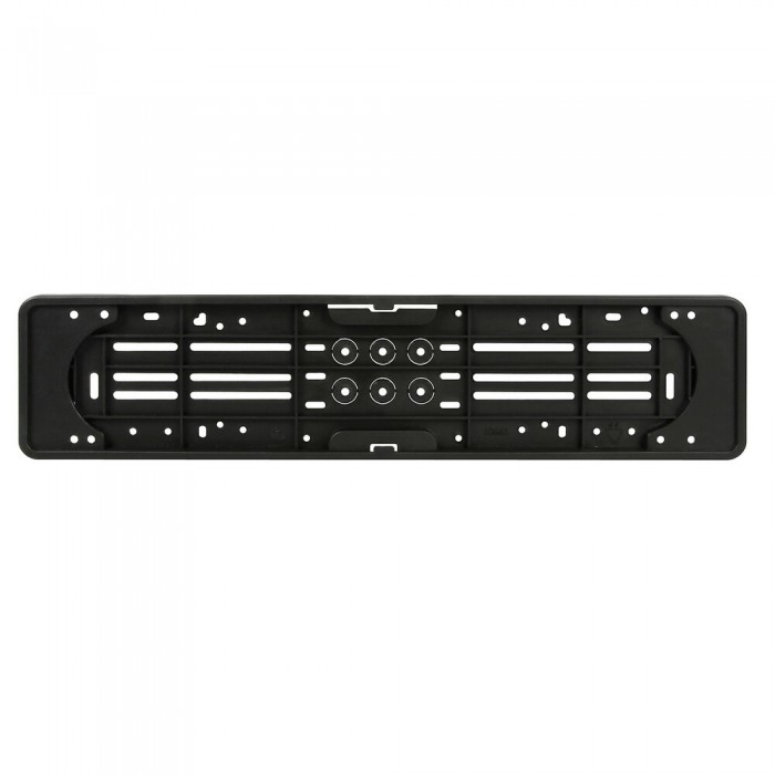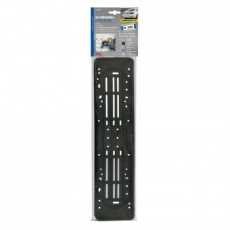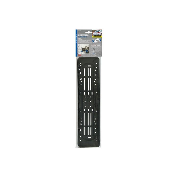 Portatarga posteriore in polipropilene nero molto resistente. Si adatta alle lievi curvature del paraurti o della carrozzeria con la plastica leggermente flessibile. Kit completo composto da: Portatarga, 4 rondelle in metallo, 6 distanziali in polipropilene, 4 viti autofilettanti, 3 bottoni di fissaggio azzurri, 1 bottone di fissaggio bianco. Dimensione: 535x125 mm