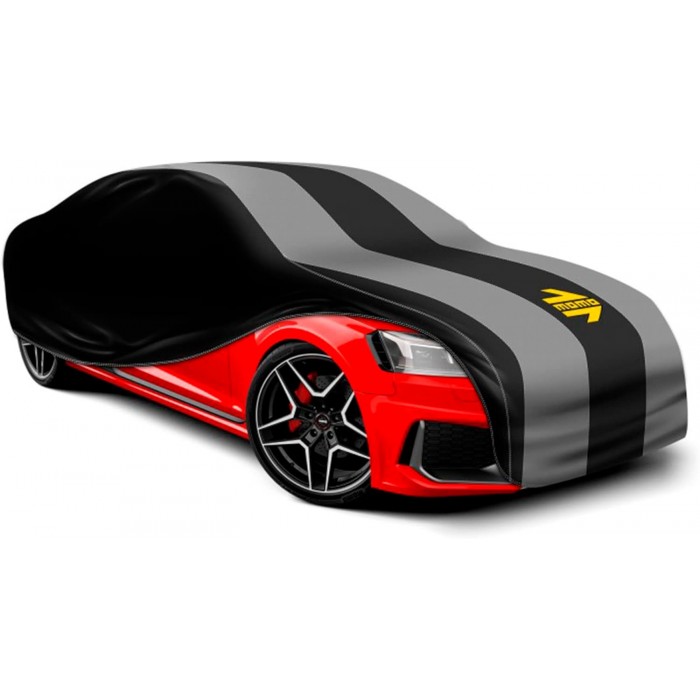 Telo copriauto con logo Momo a strato singolo realizzato in TNT (tessuto non tessuto), materiale morbido ma resistente, ideale per proteggere la carrozzeria da raggi UV, polvere e graffi. Design bicolore nero/grigio con logo frontale Momo in giallo per un tocco sportivo ed elegante.