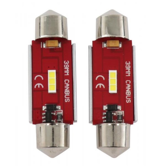 Coppia lampadine C5W 12-24V 6W con 1 led 1860. Luce bianchissima grazie all'elevata temperatura di colore (6000K). Attacco T11. Lunghezza 39 mm. Con Canbus testati.