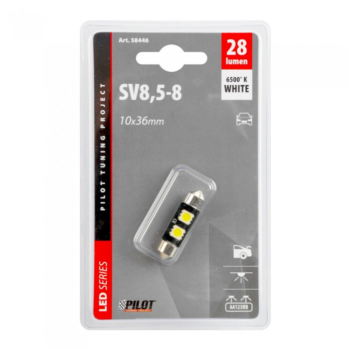 Con resistenza incorporata per ingannare le centraline can-bus ed evitare la spia accesa sul cruscotto Non omologate per uso stradale Utilizzare esclusivamente su veicoli da competizione, da esposizione, per uso nel fuoristrada o su strade private 12V Hyper-Led 6, 2 SMDx3 chips, (C5W), 10x36 mm, SV8.5-8, 1 pezzo, blister, bianco, doppia polarità.