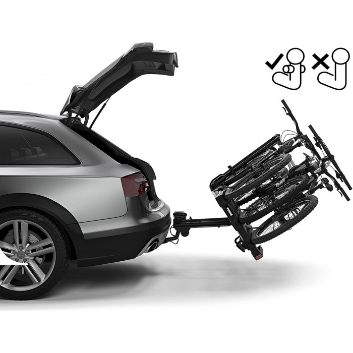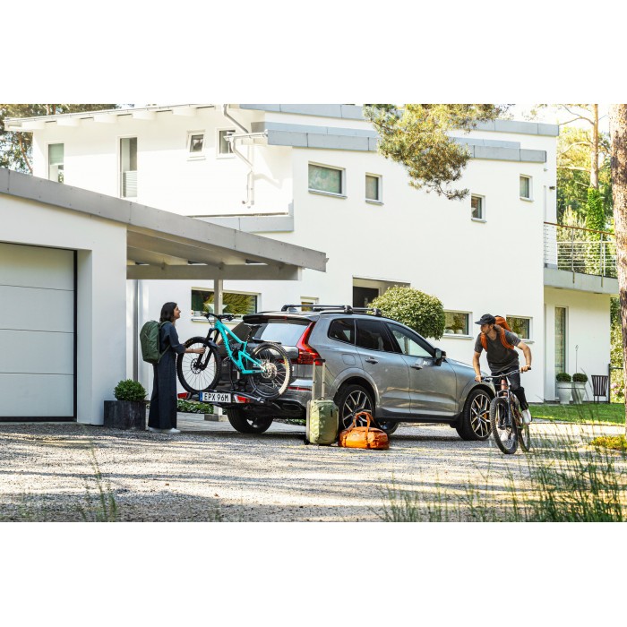 Facile da montare: in solo due operazioni si monta sul gancio traino, si apre ed è pronto per l'uso. Provvisto di braccetti blocca telaio rimovibili con pomello AcuTight dotato di indicatore di coppia che fa “click” una volta raggiunto il serraggio ottimale, e di lunghe cinghie regolabili con cricchetto per un fissaggio semplice e sicuro delle ruote (con pneumatici larghi fino a 4.7"). Con pratica funzione basculante a pedale per un facile accesso al bagagliaio anche con le bici montate. Antifurto grazie alla doppia serratura, bici su portabici e portabici su gancio traino.