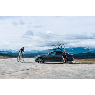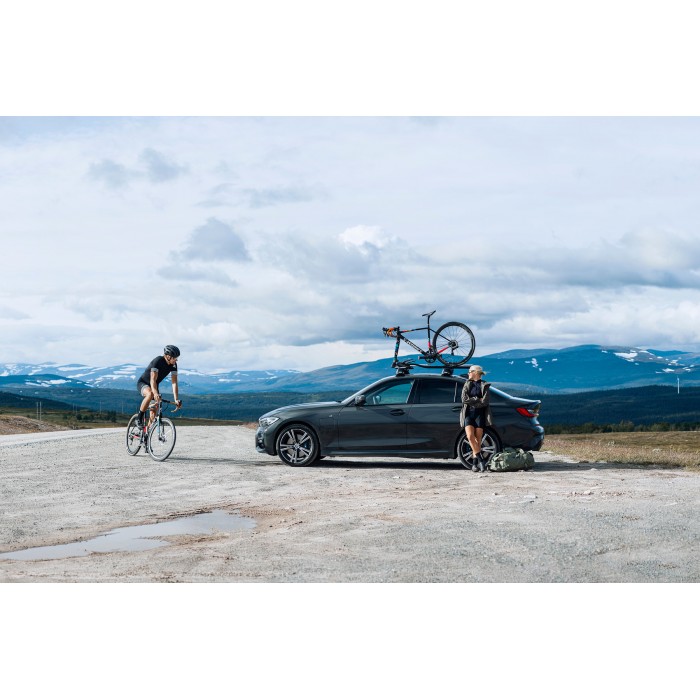 Portabici da tetto Thule TopRide con fissaggio a forcella, adatto sia per bici con sgancio rapido che per quelle con perno passante. Facile e veloce da montare/smontare dal portatutto grazie alla leva di rilascio rapido. Provvisto di doppia serratura antifurto, bici su portabici e portabici su barre. Conforme alle norme City Crash.