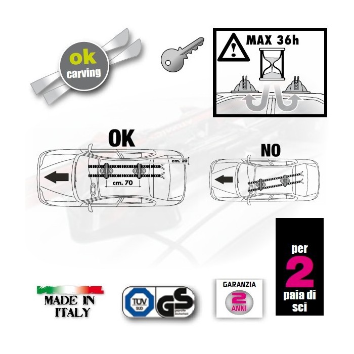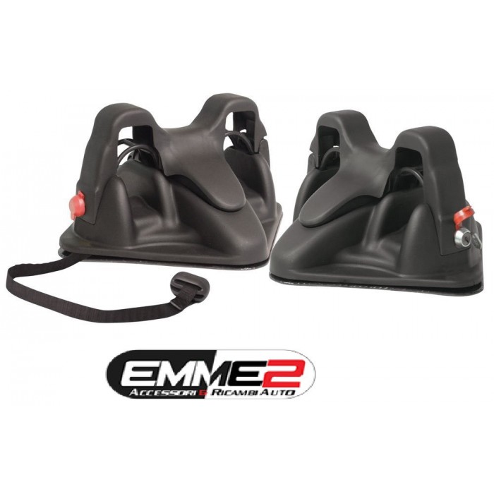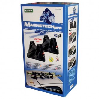 Portasci magnetico con chiave antifurto, modello MAGNETECH PRO, per due coppie di sci. Questo portasci è semplice, economico e di veloce applicazione. Adatto per il trasporto di due paia di sci (slalon, carving o nordic) che rimangono fissati alla loro base grazie a dei robusti fermi dotati di serratura antifurto con tappi antighiaccio. Questo modello è carenato per assicurare una migliore aerodinamica anche ad alte velocità. Dotato di cinghia di sicurezza. Adatto per tutte le vetture senza tettino apribile in vetro o plastica anche con tetto non troppo curvo