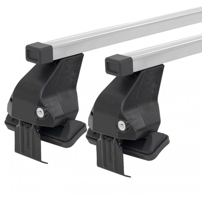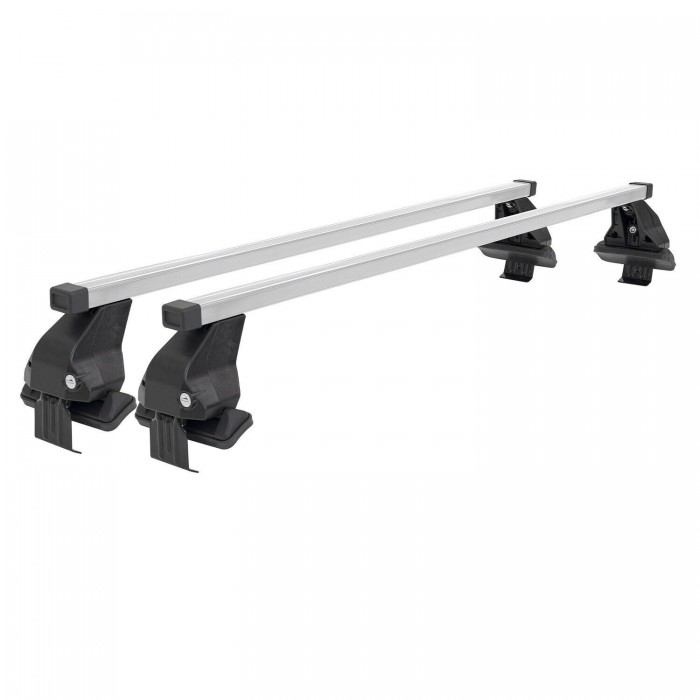 Soluzione completa di Kit di montaggio e di barre portatutto Menabo SilverLine con profilo in acciaio zincato rivestito con guaina in PVC antiscivolo e antigraffio, per tetti normali e con punti fissi. Serrature opzionali (cod. 000084800000).