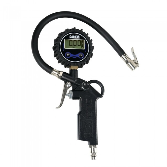 Serie professionale, per gonfiare/sgonfiare gli pneumatici e misurarne la pressione, efficienza testata fino a ± 1 PSI di tolleranza per una massima precisione con manometro con ampio display digitale e schermo LCD retroilluminato per facilitarne la lettura e consentirne l’utilizzo anche durante le ore notturne. Valvola di scarico per far defluire l'aria in caso di eccessiva pressione dello pneumatico con spegnimento manuale oppure automatico dopo circa 3 minuti di inattività, struttura in metallo. Manometro con guscio protettivo in gomma resistente agli urti, con tubo flessibile in gomma da cm 30 con testina di accoppiamento rapido consente di raggiungere e operare con facilità anche sulle valvole situate nelle posizioni più scomode o lontane. Possibilità di selezionare fino a 4 differenti scale di misura con i relativi intervalli: 0~170 PSI, 0~12 Bar, 0~1200 KPa, 0~12 Kgf/cm². Funziona con 2 pile AA non incluse nella confezione con innesto aria con attacco rapido da 1/4"