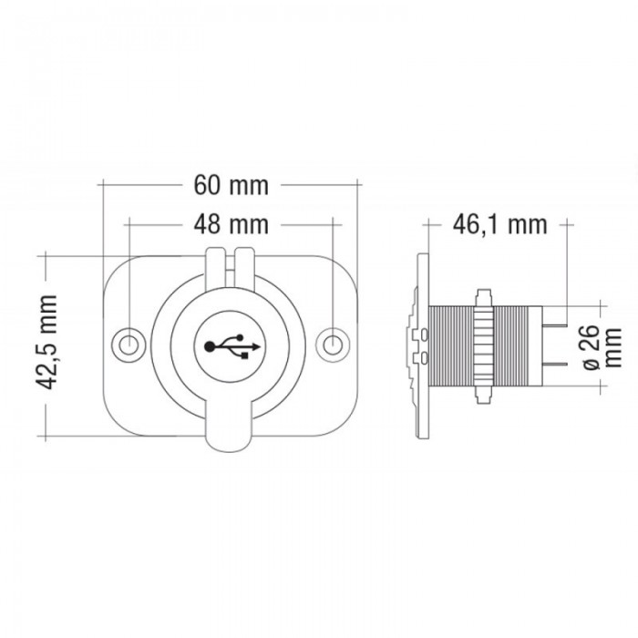 Doppia presa USB 5V/1A - 5V/2,1A per caricare gps, cellulari e smartphone, consolle PSP, tablet, lettori mp3/mp4 ed altri apparecchi digitali. Con tappo di protezione, ideale per uso sia interno che esterno. Montaggio ad incasso. Universale 12/24V.