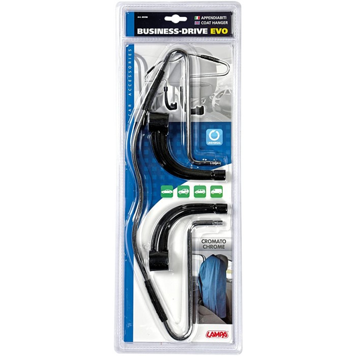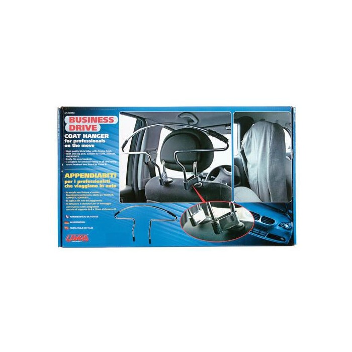Appendiabiti auto Lampa in metallo con finitura al cromo, rivestimento antiscivolo adatto per giacche, cappotti, soprabiti. Si applica alle aste del poggiatesta, universale per la maggior parte dei poggiatesta.